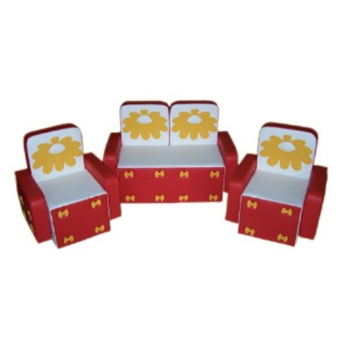 В комплекте: диван 1 шт., кресло 2 шт. Размеры: диван — 75*38*50 см., кресло — 45*38*50 см. Материалы: ВИК (винилискожа), поролон. Описание: Легко трансформирующаяся безопасная игровая кукольная мебель из поролона и винилискожи может быть использована для оформления игровой зоны в детском саду и для домашнего использования. Данные для транспортировки: объем 0,35 м3., вес 7 кг., 1 место.