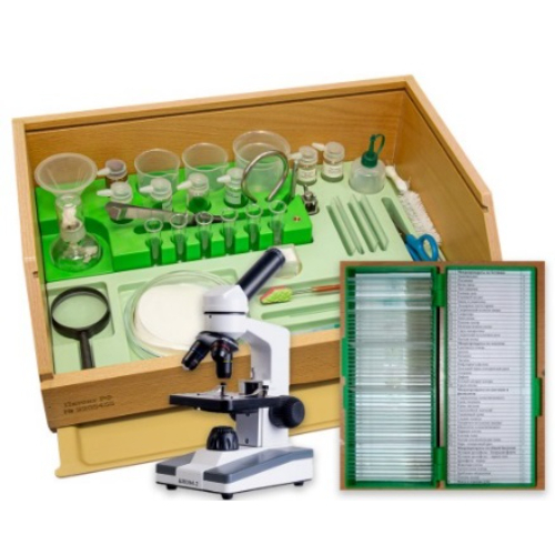 Биологическая микролаборатория Стаканы (4 шт.), воронка, спиртовка, зажим пробирочный, штатив с кольцом, пробирки(6шт.), флаконы для реактивов с капельницами (6шт.), чашка Петри, стеклянная палочка, флакон с микродозатором, пинцет, скальпель брюшистый, иглы препаровальные, стаканы лабораторные, предметные и покровные стекла, флакон с дозатором, ерш пробирочный. Микроскоп оснащен 3 объективами (х4, х10, х40) (механизм быстрой смены объективов, набор диафрагм, осветитель, съемный окуляр х20). Набор микропрепаратов включает 43 наименования. (18 по ботанике, 9 по зоологии, 9 по анатомии и физиологии, 7 по общей биологии).