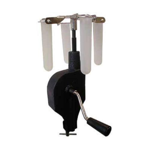Центрифуга выполнена в виде модели и предназначена для демонстрации принципа устройства и действия простейшей центрифуги. Прибор состоит из крестообразной пластины с вилками на концах. К вилкам подвешены на осях кольца с пластмассовыми полыми цилиндрами для вкладывания в них стеклянных пробирок. Пластина закреплена с помощью втулки на шпинделе центробежной машины. Передача вращательного движения от рукоятки к шпинделю осуществляется посредством червячной передачи. Отношение числа оборотов рукоятки к числу оборотов шпинделя 1:16. Центробежная машина с центрифугой закрепляется на столе с помощью струбцины. Может быть использована для демонстрации ряда опытов, где требуется вращательное движение.