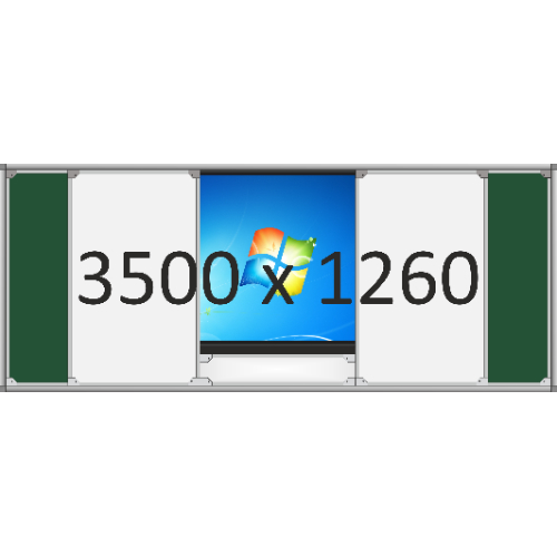 Доска раздвижная рельсовая (маркер в центре+мел по бокам), 3500х1260 мм. с нишей для интерактивной панели 1820х1070х160 мм.