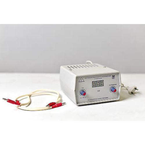 Генератор высокого напряжения предназначен для получения электрических разрядов при изучении курсов физики и химии средней школы. Прибор используется в демонстрационных опытах для воспламенения газов, получения озона и изучение его свойств, наблюдения свечения неона, в опытах по электростатике. Габаритные размеры в упаковке: 210х160х105 мм. Вес: не более 1,0 кг. Напряжение сети питания 220 В. Частота 50 Гц. Выходное постоянное напряжение 0…25 кВ. Ток нагрузки на выходе генератора не более 0,001 А. Комплектность: генератор высокого напряжения – 1 шт. провода соединительные с зажимом типа «крокодил» – 2 шт. руководство по эксплуатации – 1 шт. Генератор собран на одной печатной плате и помещен в пластмассовый корпус. На лицевой стенке имеется индикатор включения генератора. Выходное постоянное напряжение генератора выведено на клеммы, установленные на крышке прибора. На переднюю панель прибора выведено две ручки «ток» и «напряжение». При различных положениях ручки «ток» максимальное напряжение, регулируемое ручкой «напряжение» будет различным.