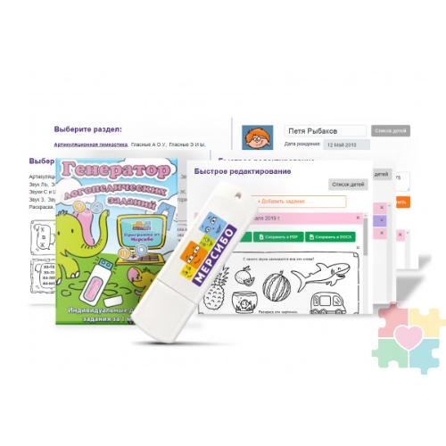 Описание: На этой флешке находится программа, которая станет отличным помощником в создании логопедических заданий для детей. Программа состоит из 527 заданий, которые помогут поставить ребенку звуки любой сложности, развить артикуляционный аппарат и мелкую моторику. Для того, чтобы составить домашнее задание на логопедию ребенку теперь не нужно много времени! Нужно всего лишь выбрать из уже существующих заданий и отправить их родителям. При необходимости можно внести свои коррективы, подписать пожелания по выполнению. Также, если требуется, можно распечатать задания в наилучшем качестве. Хранить задания можно в самых удобных и популярных форматах — docx и pdf. Также Вы сможете сохранять результаты каждого ребенка в специальном “дневнике ребенка”. Так вы сможете оценить объем работы, проделанной с ребенком, динамику прогресса, сохранять копии выполненных заданий в случае утери. Все задание выполнены профессионалами своего дела, и они гарантированно помогут родителям и их детям, а также преподавателям! Для кого предназначен: Программным обеспечением могут уверенно пользоваться логопеды, дефектологи, воспитатели в детских логопедических группах. Игры предназначены для детей от 3 до 7 лет с различным уровнем развития. Комплектация набора: В комплекте находится флешка с программой для создания домашних логопедических заданий. Технические требования: Чтобы заниматься, необходим компьютер с Windows 7 и новее., Microsoft Word 2013 или Adobe Reader, можно использовать старшие версии ПО.