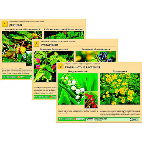 Авторы: А.Г. Горецкая, И.Л. Марголина Пособие предназначено для использования в начальной школе в качестве раздаточного материала на уроках «Окружающий мир», а также во время экскурсий в природу. Габаритные размеры в упаковке (дл.*шир.*выс.), см: 30,5*21,5*3,5. Вес, кг, не более 0,3. Комплектность: листы с фотографиями растений – 9 шт., руководство по эксплуатации – 1 шт.Пособие состоит из 9 полноцветных листов формата А4, напечатанных на картоне и ламинированных пленкой. В пособии представлены фотографии 18 видов ядовитых растений, наиболее распространенных на территории России. Древесные растения: каштан конский обыкновенный, робиния лжеакация («белая aкация»), тисс ягодный, магнолия крупноцветковая. Кустарники: бересклет бородавчатый, бирючина обыкновенная, бузина травянистая, волчеягодник обыкновенный, жимолость лесная, снежноягодник белый. Травянистые растения: белладонна европейская, белокрыльник болотный, борщевик Сосновского, вех ядовитый, воронец колосистый, вороний глаз обыкновенный, ландыш майский, лютик едкий.