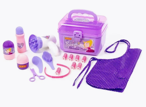 Набор включает в себя 29 элементов. Малыши смогут представить себя настоящими стилистами, создавая прически и макияж, делая стрижки и укладки. Оригинальный обучающий комплекс предназначен для детей с 3 лет, способствует развитию мелкой моторики и мышления. В комплекте с ним идет удобный пластиковый бокс.
