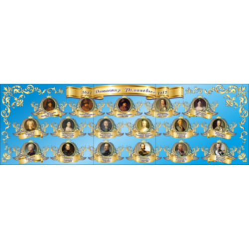 Стенд «Династия Романовых» Размеры:4х1,3м. Материал: пластик ПВХ 3мм Рисунок: пленка с фотопечатью 720 dpi, ламинирующая пленка