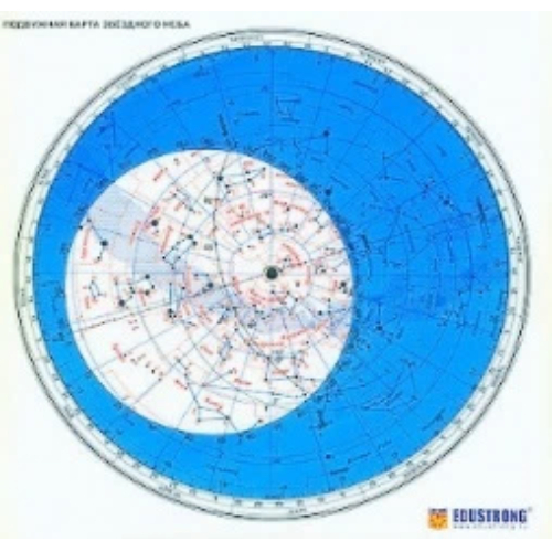 Подвижная карта звездного неба предназначена для использования в качестве раздаточного материала на уроках физики, естествознания и географии при изучения звездного неба, для решения некоторых задач практической и сферической астрономии и приобретения навыков ориентирования на местности. Габаритные размеры упаковки: (дл.*шир.*выс.), см: 22*22*0,02. Вес, кг, не более 0.035. Комплектность: карта звездного неба – 1 шт., руководство по эксплуатации – 1 шт. Карта состоит из двух кругов: основного и подвижного. На основной круг нанесены черными кружками звезды ярче третьей звездной величины и некоторые более слабые. Диаметры кружков отличаются в зависимости от блеска звезд. Группами точек и черточек показаны некоторые звездные скопления, туманности и галактики. Широкая голубая полоса – Млечный Путь. Границы созвездий показаны пунктирными линиями, сетка экваториальных координат (склонение δ и прямое восхождение α) – голубыми линиями. В центре Северный полюс мира. Окружность, имеющая нулевое склонение, – небесный экватор. Черная овальная линия, пересекающая небесный экватор в двух точках (весеннего и осеннего равноденствия), – эклиптика. Подвижный круг предназначен для изучения суточного и годового изменения вида звездного неба в средних широтах северного полушария Земли (около 50–60° северной широты), а также определения моментов кульминации звезд и Солнца. Контур овального выреза (прозрачной части) на подвижном круге – линия горизонта, на которой отмечены точки юга, севера, запада и востока. Линия, соединяющая точки севера и юга, – неподвижный небесный меридиан.