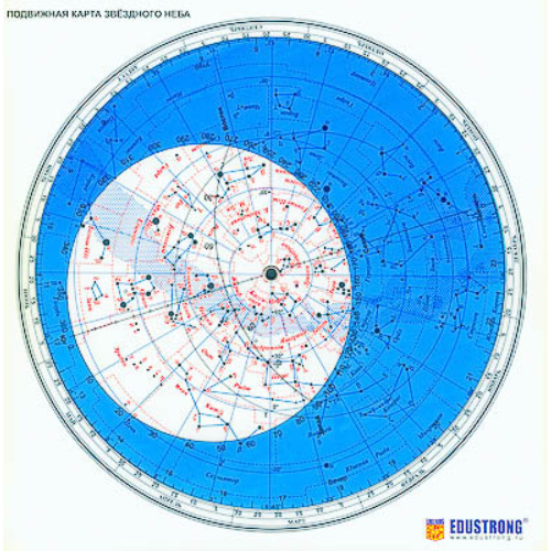 Подвижная карта звездного неба предназначена для использования в качестве раздаточного материала на уроках физики, естествознания и географии при изучения звездного неба, для решения некоторых задач практической и сферической астрономии и приобретения навыков ориентирования на местности. Габаритные размеры упаковки: (дл.*шир.*выс.), см: 22*22*0,02. Вес, кг, не более 0.035. Комплектность: карта звездного неба – 1 шт., руководство по эксплуатации – 1 шт. Карта состоит из двух кругов: основного и подвижного. На основной круг нанесены черными кружками звезды ярче третьей звездной величины и некоторые более слабые. Диаметры кружков отличаются в зависимости от блеска звезд. Группами точек и черточек показаны некоторые звездные скопления, туманности и галактики. Широкая голубая полоса – Млечный Путь. Границы созвездий показаны пунктирными линиями, сетка экваториальных координат (склонение δ и прямое восхождение α) – голубыми линиями. В центре Северный полюс мира. Окружность, имеющая нулевое склонение, – небесный экватор. Черная овальная линия, пересекающая небесный экватор в двух точках (весеннего и осеннего равноденствия), – эклиптика. Подвижный круг предназначен для изучения суточного и годового изменения вида звездного неба в средних широтах северного полушария Земли (около 50–60° северной широты), а также определения моментов кульминации звезд и Солнца. Контур овального выреза (прозрачной части) на подвижном круге – линия горизонта, на которой отмечены точки юга, севера, запада и востока. Линия, соединяющая точки севера и юга, – неподвижный небесный меридиан.
