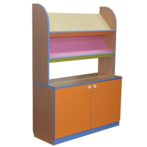 Материал: ЛДСП. Размер: 100*37*140 см. Описание: Основной цвет бук или кремовый. Фасады цветные по желанию заказчика. Стеллаж с тумбой и двумя дверками, внутри тумбы две полки. В верхней части стеллажа две наклонные полки с бортиком для демонстрационного материала или книг. Данные для транспортировки: объем 0,095 м3., вес 70 кг., 1 место.