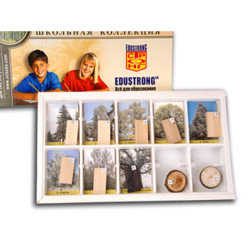 Автор: И. Л. Марголина. Коллекция предназначена для использования в качестве раздаточного материала. Комплектность: образцы древесин (продольные срезы) – 8 шт., образцы древесин (поперечные срезы) – 2 шт., фотографии растений – 8 шт., руководство по эксплуатации – 1 шт. В состав коллекции входят образцы древесины древесных растений, наиболее распространенных на территории России (ели, сосны, лиственницы, дуба, липы, березы, осины), а также африканского черного дерева как представителя ценных пород древесины. Продольные срезы перечисленных растений, а также поперечные срезы ели и осины демонстрируют структуру, цвет и текстуру древесины. Натуральные материалы сопровождают 8 цветных фотографий (5×7 см) общего вида растений. Фотографии напечатаны на картоне и ламинированы глянцевой пленкой. Образцы пронумерованы.