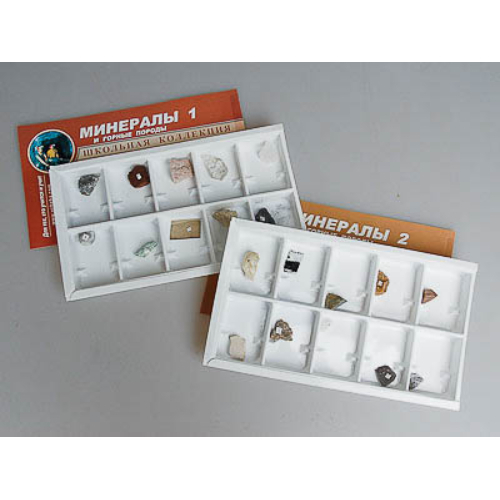 Коллекция предназначена для демонстрациина уроках географии. Габаритные размеры в упаковке (дл.*шир.*выс.), см 30*17,5*2,5. Вес, кг, не более 0,4. Образцы пронумерованы соответственно списку и положены в две коробки с ячейками. Пособие комплектуется руководством по эксплуатации и ламинированным вкладышем, содержащим информацию о составе и применении минералов и горных пород. Состав коллекции: магнетит (магнитный железняк), боксит, ортоклаз (полевой шпат), гипс пластинчатый, кварц кристаллический, кальцит, слюда флогопит, слюда мусковит, сера, графит, тальк, слюда биотит, пирит, халцедон (кремень), песчаник, известняк, гранит красный, мрамор, базальт, гранит серый.