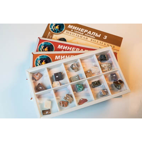 Коллекция предназначена для демонстрации на уроках неорганической химии и географии. Габаритные размеры в упаковке: 300х175х75 мм. Вес: не более 0,6 кг. Состав коллекции: магнетит (магнитный железняк) боксит ортоклаз (полевой шпат) гипс пластинчатый кварц кристаллический кальцит, слюда флогопит слюда мусковит сера графит тальк слюда биотит пирит халцедон (кремень) песчаник известняк гранит красный мрамор базальт гранит серый, а также двадцать образцов различных поделочных камней Производитель оставляет за собой право изменять состав коллекции, не ухудшая ее функциональные свойства. Образцы пронумерованы и упакованы в три коробки с ячейками. Пособие комплектуется руководством по эксплуатации и ламинированным вкладышем, содержащим информацию о составе и применении минералов и горных пород.