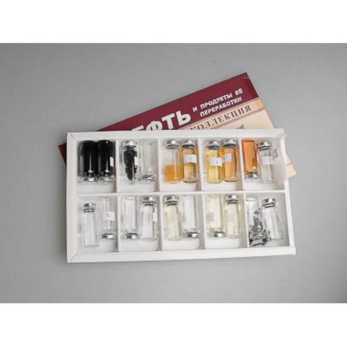 Коллекция предназначена для использования в качестве раздаточного материала. Габаритные размеры в упаковке (дл.*шир.*выс.), см: 30*17,5 *2,5. Вес, кг, не более 0,47. Состав коллекции: сырая нефть, мазут, пластмасса, каучук, вазелин, парафин, соляровое масло, веретенное масло, машинное масло, цилиндровое масло, гудрон, бензол, толуол, нефтяной газ, петролейный эфир, бензин, лигроин, керосин, газойль, соляр, крекинг керосин, крекинг бензин. Образцы расфасованы в стеклянные пузырьки с пробкой и обжимной крышкой и полиэтиленовые пакетики. Пузырьки и пакетики пронумерованы соответственно списку и упакованы в коробку с ячейками. Горючие, взрывчатые и ядовитые вещества имитированы. Коллекция сопровождается руководством по эксплуатации и ламинированным вкладышем с информацией о свойствах, перегонке и применении продуктов переработки нефти.