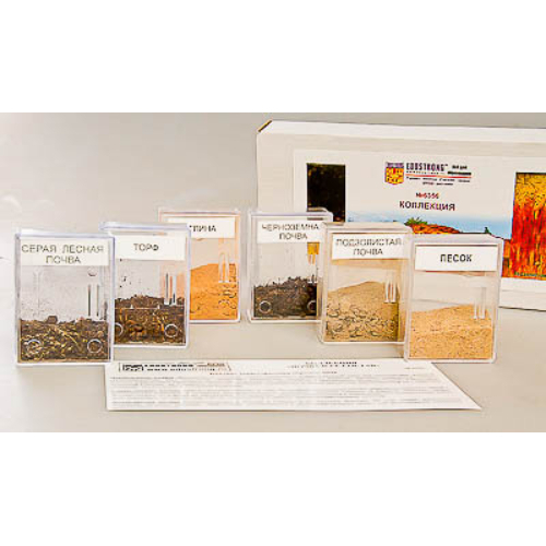 Коллекция предназначена для использования в качестве демонстрационного материала. Габаритные размеры в упаковке (дл.*шир.*выс.), см: 30,5*22*3,5. Вес, кг, не более 0,7. Коллекция включает образцы почв и почвообразующих пород. Образцы помещены в прозрачные пластмассовые коробки, снабженные наклейками с наименованием. Пособие комплектуется руководством по эксплуатации и ламинированным вкладышем, содержащим информацию о свойствах, территории распространения и использовании почв и почвообразующих пород. Состав коллекции: образцы черноземной, серой лесной и подзолистой почв, образцы песка, глины и торфа.