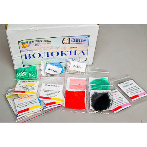Коллекция предназначена для использования в качестве демонстрационного материала. Габаритные размеры в упаковке: 220х165х90. Вес: не более 0,15 кг. Коллекция включает образцы волокон и изготовленных из них тканей. Образцы разложены в пакеты с этикетками, содержащими название образца, тип волокна и краткую информацию о его свойствах, получении и применении. Также коллекция включает образцы волокон (расфасованы в маленькие пакетики с этикетками), предназначенные для расходования при проведении опытов по идентификации волокон и определении их свойств. Пособие комплектуется руководством по эксплуатации и ламинированным вкладышем, содержащим классификацию волокон, информацию об их свойствах, производстве и применении. Состав коллекции: лен хлопок шерсть шелк асбест вискоза стекловолокно капрон лавсан нитрон