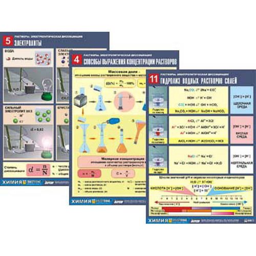 формат А1, ламинированные Комплектация: 1. Учебное пособие «Растворы. Электролитическая диссоциация. Методические рекомендации» (Авторы: Т.С. Назарова, А.Г. Назарова). 2. Комплект учебно-наглядных пособий формата А1 с полноцветной двухсторонней печатью и матовой двухсторонней ламинацией в количестве 12 таблиц. Комплект охватывает следующие темы: 1. «Дисперсные системы» 2. «Свойства воды» 3. «Кривые растворимости веществ» 4. «Способы выражения концентрации растворов» 5. «Электролиты» 6. «Гидратация ионов» 7. «Растворение веществ с ионной связью» 8. «Растворение веществ с ковалентной полярной связью» 9. «Кислотно-основные реакции» 10. «Реакции ионного обмена» 11. «Гидролиз водных растворов солей» 12. «Иониты»