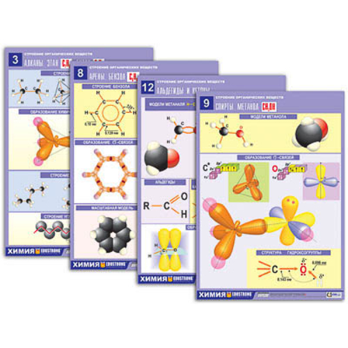 формат А1, ламинированные Комплектация: 1. Учебное пособие «Строение органических веществ. Методические рекомендации» (Авторы: Т.С. Назарова, Н.С. Куприянова, Д.Н. Кожевников). 2. Комплект учебно-наглядных пособий формата А1 с полноцветной двухсторонней печатью и матовой двухсторонней ламинацией в количестве 16 таблиц. Комплект охватывает следующие темы: 1. «Строение атома углерода. Виды гибридизации» 2. «Алканы. Метан» 3. «Алканы. Этан. Бутан» 4. «Изомерия алканов» 5. «Алкены. Этен» 6. «Алкины. Этин» 7. «Изомерия алкенов» 8. «Арены. Бензол» 9. «Спирты. Метанол» 10. «Водородная связь» 11. «Фенол» 12. «Альдегиды и кетоны» 13. «Карбоновые кислоты» 14. «Амины» 15. «Анилин» 16. «Гомологические ряды»