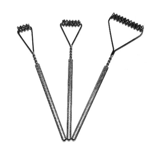 Комплект массажных логопедических зондов состоит из 3 инструментов: 1. Большой зонд с широкой рабочей поверхностью, вращается во время проведения массажа лицевой мускулатуры. Позволяет захватить большую массируемую площадь за одно движение. Также подходит для использования в рефлексогенной зоне ладошек. 2. Средний зонд — наиболее нравится детям, универсальный инструмент, подходящий для массажа в области лица и языка, а также массажа рефлексогенных зон. С помощью зонда можно выполнять прокатывающие движения, разминания и растирания, проводить артикуляционную гимнастику. 3. Маленький зонд — миниатюрный инструмент, предназначенный для массажа на круговой мышце рта и боковых краях языка. Дополнительно может применяться для проведения артикуляционной гимнастики. Комплект зондов выполнен из нержавеющей стали, обеспечивающей долговечность эксплуатации. При использовании «Аламинола» для стерилизации инструментов не рекомендуется оставлять их в растворе дольше 1 часа. Комплектация Комплект зондов — 3 шт