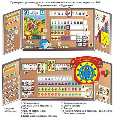 Комплект наглядных пособий изготовлен из картона и полиэтилена и состоит из следующих пособий: 1. Сказочный счет (10 листов, 430*580 мм). 2. Линейка. Счет от 1 до 10. 3. Абак с предметными картинками и геометрическими телами и фигурами. 4. Круги по составу чисел первого десятка. 5. «Компьютер». 6. Касса цифр с наборным полотном. 7. Числовая горка. 8. Домино (3 вида). 9. Танграм. 10. Линейка. Счет от 1 до 20. 11. Телефон-справочник.