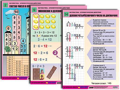 Комплект содержит: 1. Учебное пособие «Математика. Арифметические действия. Методические рекомендации» (Авторы: Е.Э. Кочурова, А.С. Анютина, С.И. Разуваева, К.М. Тихомирова). 2. Комплект учебно-наглядных пособий формата А1 с полноцветной двухсторонней печатью и матовой двухсторонней ламинацией в количестве 14 таблиц. Таблицы: 1. Способы сложения и вычитания чисел в пределах 10. 2. Состав чисел в пределах 10. 3. Названия чисел при сложении и вычитании. 4. Способы сложения и вычитания чисел в пределах 20. 5. Устные приемы сложения чисел в пределах 100. 6. Устные приемы вычитания чисел в пределах 100. 7. Письменное сложение и вычитание чисел в пределах 100. 8. Названия чисел при умножении и делении. 9. Умножение и деление. 10. Деление с остатком. 11. Письменное умножение трёхзначного числа на однозначное. 12. Письменное деление трёхзначного числа на однозначное. 13. Умножение четырёхзначного числа на двузначное. 14. Деление четырёхзначного числа на двузначное.