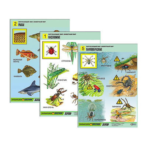 Комплект содержит: 1. Учебное пособие «Окружающий мир. Животный мир. Методические рекомендации» (Авторы: К.М. Тихомирова, Е.А. Нефёдова, Н.А. Писаренко, А.В. Ермаков). 2. Комплект учебно-наглядных пособий формата А1 с полноцветной двухсторонней печатью и матовой двухсторонней ламинацией в количестве 8 таблиц. Таблицы: 1. Насекомые. 2. Рыбы. 3. Птицы. 4. Звери. 5. Паукообразные. 6. Земноводные и пресмыкающиеся. 7. Птицы перелетные, оседлые и кочующие. 8. Животноводство.