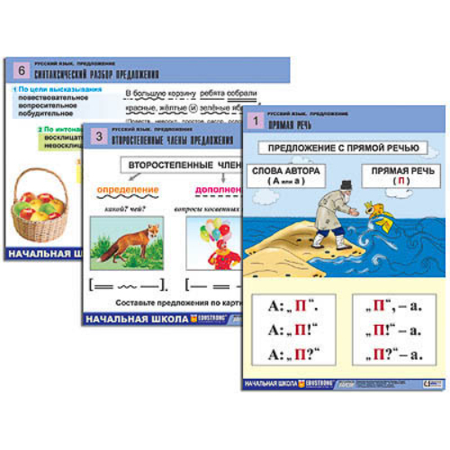 Комплект содержит: 1. Учебное пособие: Н.А. Писаренко, Е.В. Тимофеева, К.М. Тихомирова. «Русский язык. Предложение. Методические рекомендации». 2. Комплект учебно-наглядных пособий формата А1 с полноцветной двухсторонней печатью и матовой двухсторонней ламинацией в количестве 6 таблиц. Таблицы: 1. Прямая речь. 2. Простые и сложные предложения. 3. Второстепенные члены предложения. 4. Однородные члены предложения. 5. Виды предложений по интонации и цели высказывания. 6. Синтаксический разбор предложения.