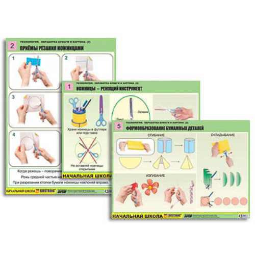 Комплект содержит: 1. Учебное пособие: Е.А. Лутцева. «Технология. Обработка бумаги и картона — 2. Методические рекомендации». 2.Комплект учебно-наглядных пособий с полноцветной двухсторонней печатью и матовой двухсторонней ламинацией в количестве 8 таблиц демонстрационных, а также 2 таблиц раздаточных. Таблицы формата А1: 1. Ножницы – режущий инструмент. 2. Приёмы резания ножницами. 3. Деление листа бумаги на части. 4. Рицовка. Биговка. 5. Формообразование бумажных деталей. 6. Приёмы наклеивания бумажных деталей. 7. Деление круга на части: две, три, четыре, пять, шесть. 8. Технология изготовления изделия. Таблицы формата А4 (для леворуких детей): 1. Ножницы. Рицовка. Биговка. 2. Приемы резания ножницами.