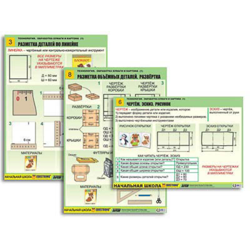 Комплект содержит: 1. Учебное пособие: Е.А. Лутцева. «Технология. Обработка бумаги и картона — 1. Методические рекомендации». 2.Комплект учебно-наглядных пособий с полноцветной двухсторонней печатью и матовой двухсторонней ламинацией в количестве 8 таблиц демонстрационных, а также 1 таблицы раздаточной. Таблицы формата А1: 1. Разметка деталей. 2. Разметка деталей копированием. 3. Разметка деталей по линейке. 4. Разметка деталей по угольнику. 5. Линии чертежа. 6. Чертёж. Эскиз. Рисунок. 7. Разметка деталей с помощью циркуля. 8. Разметка объёмных деталей. Развёртка. Таблица формата А4 (для леворуких детей): Разметка деталей.