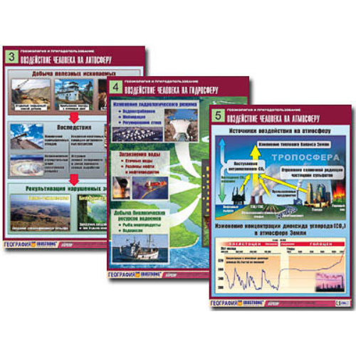 Комплект содержит: 1. Учебное пособие: О.А. Климанова, И.Л. Марголина. «Геоэкология и природопользование. Методические рекомендации». 2. Комплект учебно-наглядных пособий формата А1 с полноцветной двухсторонней печатью и матовой двухсторонней ламинацией в количестве 8 таблиц. Таблицы: Глобальные проблемы человечества. Этапы взаимодействия человека и природы. Воздействие человека на литосферу. Воздействие человека на гидросферу. Воздействие человека на атмосферу. Воздействие человека на биосферу. Город и окружающая среда. Окружающая среда и здоровье человека.