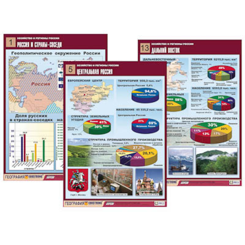 Комплект содержит: 1. Учебное пособие О.А. Климанова, С.Н. Труднева. «Хозяйство и регионы России. Методические рекомендации». 2. Комплект учебно-наглядных пособий формата А1 с полноцветной двухсторонней печатью и матовой двухсторонней ламинацией в количестве 14 таблиц. Таблицы: Россия и страны-соседи. Роль крупнейших городов в населении и хозяйстве Росси. Регионы – лидеры в производстве промышленной продукции. Регионы – лидеры в производстве сельскохозяйственной продукции. Центральная Россия. Европейский Северо-Запад. Европейский Север. Поволжье. Европейский Юг. Урал. Западная Сибирь. Восточная Сибирь. Дальний Восток. Природное и культурное наследие России.