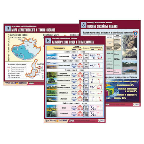 Комплект содержит: 1. Учебное пособие: О.А. Климанова, И.Л. Марголина. «Природа и население России. Методические рекомендации». 2. Комплект учебно-наглядных пособий формата А1 с полноцветной двухсторонней печатью и матовой двухсторонней ламинацией в количестве 10 таблиц. Таблицы: Физико-географическое положение России. Моря Северного Ледовитого океана. Моря Атлантического и Тихого океанов. Лесные и водные ресурсы России. Топливно-энергетические ресурсы России. Климатические пояса и типы климата. Высотная поясность в горах России. Опасные стихийные явления. Численность населения России. Внутренняя миграция в России и ее причины.