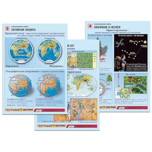 Авторы: И.Л. Марголина, Т.А. Воробьева. Пособие предназначено для использования в качестве раздаточного материала на уроках географии. Габаритные размеры в упаковке (дл.* шир.* выс.), см: 30*21*0,5. Вес, кг, не более 0,07. Пособие состоит из 8 полноцветных таблиц формата А4, ламинированных глянцевой пленкой. Таблицы: 1. Изображение поверхности Земли. 2. Географические координаты. 3. Изображение рельефа. 4. Ориентирование на местности. 5. Изображение территорий. 6. Масштаб. 7. Разнообразие географических карт. 8. Геоинформационные системы (ГИС).