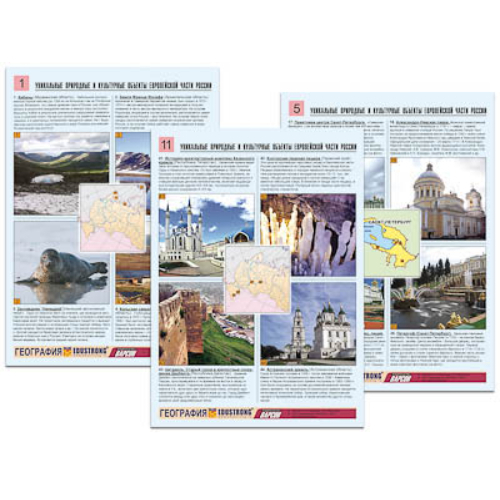 Комплект таблиц по географии раздат. «Уникальные объекты Европейской части России» (цв,лам,А4,12шт.)