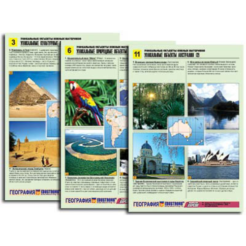 Комплект таблиц по географии раздат. «Уникальные объекты южных материков» (цвет, лам, А4, 12 шт.)
