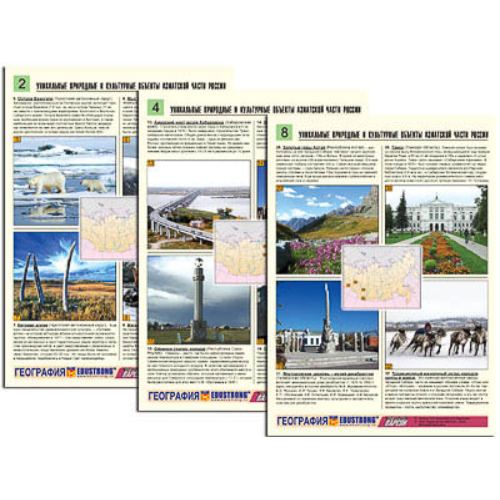 Комплект таблиц по географии раздат. «Уникальные объекты Азиатской части России» (цв,лам,А4,8шт.)