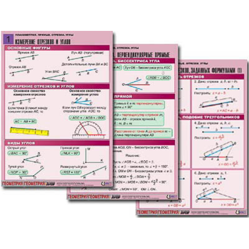 Комплект таблиц по геометрии «Планиметрия. Прямые. Отрезки. Углы» (8 табл., А1, лам.)