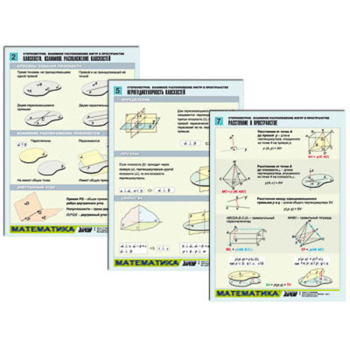 Пособие предназначено для использования в качестве раздаточного материала на уроках геометрии. Габаритные размеры в упаковке (дл.*шир.*выс.), см: 30*21*0,5. Вес, кг, не более 0,1. Пособие состоит из 8 полноцветных таблиц формата А4, ламинированных глянцевой пленкой: 1. Прямые и плоскости в пространстве. 2. Плоскости. Взаимное расположение плоскостей. 3. Параллельность прямых и плоскостей. 4. Перпендикулярность прямой и плоскости. 5. Перпендикулярность плоскостей. 6. Изображение плоских фигур в параллельной проекции. 7. Расстояние в пространстве. 8. Углы в пространстве.