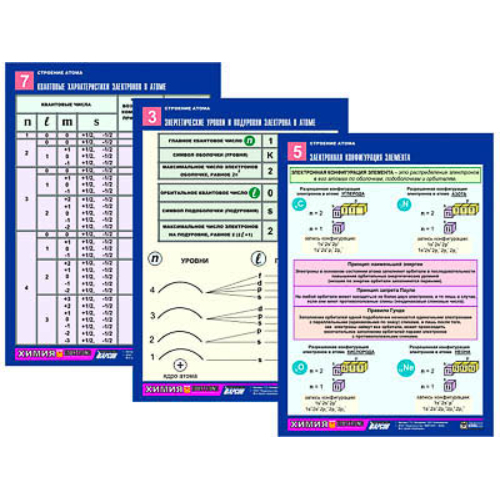 Предназначены для использования в качестве раздаточного материала по курсу химии. Выполнены на плотной мелованной бумаге с полноцветной печатью формата А4 и ламинированы пленкой. Комплектность: «Исторические модели атома» «Структура атома» «Энергетические уровни и подуровни электрона в атоме» «Квантовые числа» «Электронная конфигурация элемента» «Распределение электронов по электронным уровням» «Квантовые характеристики электронов в атоме» «Строение атомов элементов II периода и свойства их высших оксидов и гидроксидов»