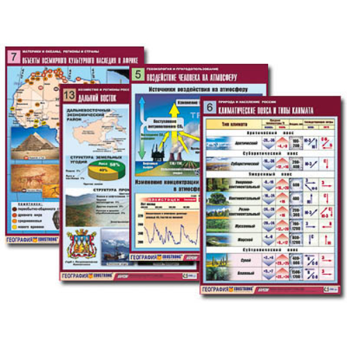 «География: источники информации и методы исследования» (10т., А1,лам.) «Геоэкология и природопользование» (8 табл., формат А1, лам.) «Материки и океаны, регионы и страны» (18 табл., А1, лам.) «Население и хозяйство мира» (16 табл., формат А1, лам.) «Природа Земли и человек» (14 табл., формат А1, лам.) «Природа и население России» (10 табл., формат А1, лам.) «Хозяйство и регионы России» (14 табл., формат А1, лам.)