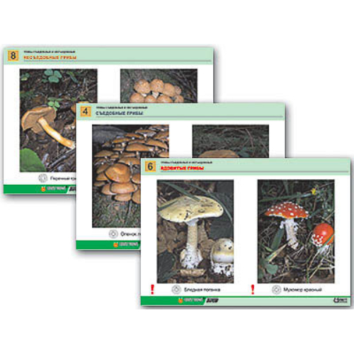 Пособие предназначено для использования в качестве раздаточного материала. Комплектность: таблицы с фотографиями грибов – 8 шт., руководство по эксплуатации – 1 шт. Пособие состоит из 8 полноцветных таблиц формата А4, напечатанных на картоне и ламинированных глянцевой пленкой. Представлено 10 фотографий съедобных грибов (белый гриб, подберезовик, подосиновик, масленок, лисичка, сыроежка, опенок летний, опенок осенний, шампиньон, груздь черный), 4 фотографии ядовитых грибов (бледная поганка, мухомор красный, мухомор пантерный, сатанинский гриб) и 2 фотографии несъедобных грибов (перечный гриб, чешуйчатка огненная), указаны их видовые названия.