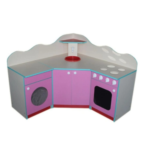 Материал: ЛДСП. Размер: 116*116*90 см. Описание: Основной цвет бук или кремовый. Фасады цветные по желанию заказчика. Игровая мебель в виде угловой кухни, нижняя часть — это закрытые тумбы: левая стилизована под стиральную машину, правая — под плиту, угловой элемент с двумя дверками. На столешнице, над угловым элементом — пластиковая чашка, над ней, на планке из ЛДСП — пластиковый кран, над которым небольшая открытая полочка. Над крайней правой тумбой пластиковые круги, стилизованные под конфорки. Данные для транспортировки: объем 0,2 м3., вес 97 кг., 3 места.