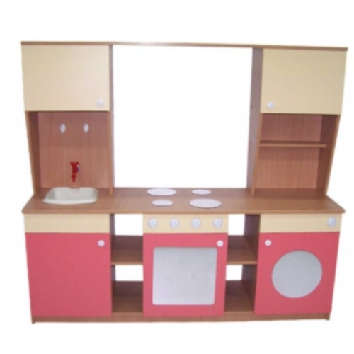 Материал: ЛДСП. Размер: 150*40*134 см. Описание: Основной цвет бук или кремовый. Фасады цветные по желанию заказчика. Нижняя часть представляет собой игровую плиту, расположенную в центральной части и соединенную двумя открытыми полками: в левой части с игровой мойкой, в правой — с игровой стиральной машиной. На столешнице — мойка с пластиковой емкостью и краном из пластика, над плитой — стилизованные конфорки. Верхняя надстройка с двумя закрытыми полками по краям, над мойкой, на задней стенки — крючки из пластика, над стиральной машиной — дополнительная открытая полочка. Полочки, фасады — цветное ЛДСП. Данные для транспортировки: объем 0,12 м3., вес 89 кг.