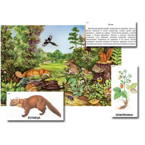 Пособие включает: плакат с изображением участка леса – 1 шт., магнитные карточки с изображениями лесных растений, животных, грибов – 43 шт., магнитные карточки для заметок — 2 шт., карточки с описаниями – 39 шт. (общее количество карточек 84 шт.), фломастер на водной основе с ластиком – 1 шт., учебное пособие «Биоразнообразие и взаимосвязи в природных сообществах» (автор Л. Н. Дорохина – 48 страниц — печать офсетная, обложка полноцветная) — 1 шт. Плакат размером 90*60 см изготовлен из магнитного материала с применением полноцветной односторонней печати, что позволяет легко крепить его на магнитной доске или экране для динамических пособий.