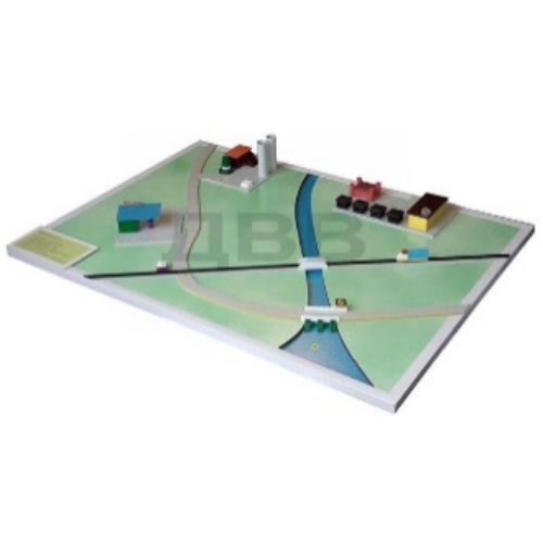 Материал изготовления — пластик, дерево. Состав макета местности: радиационно опасный объект, химически опасный объект, взрывопожароопасный объект, опасные транспортные средства (спецмашины), опасное техническое сооружение, автодорога и ж/д дорога интегрированные в транспортную развязку, необорудованный водоём. Размеры: 700х500х100 мм. (Размеры можно изменить).