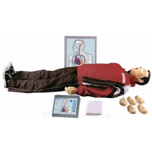 Т12 «Максим III-01 » — манекен с табло Тренажер сердечно — легочной и мозговой реанимации, пружинно — механический, с индикацией правильности выполнения действий, настенным табло и тестовыми режимами –манекен Габаритные размеры тренажера «Максим III-01»: 170 х 55 х 25 см; Вес тренажера с пультом и табло 11,6 кг. Тренажер представляет собой полную модель человека и предназначен для отработки навыков оказания экстренной доврачебной помощи. Тренажер снабжен электронным пультом контроля-управления, с помощью которого определяется: правильность положения головы, состояние поясного ремня, достаточность вдуваемого воздуха, усилие компрессии, правильность положения рук при непрямом массаже сердца, правильность проведения реанимации одним или двумя спасателями, состояние зрачков пострадавшего, появление пульса. Тренажер работает в пяти режимах: 1 — учебный — используется для отработки отдельных элементов реанимации; 2 — тестовый — режим реанимации одним спасателем (2-15); 3 — тестовый — режим реанимации двумя спасателями (1-5); 4 — тестовый — режим, (2-30); 5 — тестовый — режим, (30-2). После правильно проведенного комплекса реанимации тренажер автоматически “оживает”: появляется пульс на сонной артерии, сужаются зрачки пострадавшего. Питание тренажера осуществляется от сети ~220В 50Гц через сетевой адаптер (220В/12В) или от автономного источника постоянного тока 12-14В через разъем на пульте и кабель, прилагаемый к тренажеру.