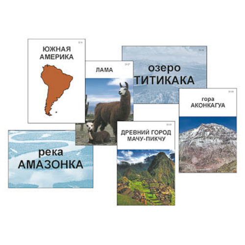 Автор: канд. геогр. наук И. Л. Марголина Пособие предназначено для использования в качестве демонстрационного материала на уроках «Окружающий мир» в начальной школе при объяснении нового материала, закреплении и проверке знаний учащихся, а также на викторинах при игре в командах. Габаритные размеры в упаковке (дл.*шир.*выс.), см: 22*16*3. Вес, кг, не более 0,46. Комплектность: карточки с маркировкой 2J-1 – 2J-35– по 1 шт. (общее количество – 35 шт.), магниты с клеевым слоем – 20 шт., руководство по эксплуатации с перечислением семи примерных заданий – 1 шт. Карточки напечатаны на картоне, ламинированы матовой (антибликовой) пленкой, снабжены магнитными креплениями, что позволяет крепить их на магнитной доске или экране для динамических пособий. Дополнительно прилагаются 20 магнитов с клеевым слоем для карточек с изображениями, которые могут подобрать учитель или учащиеся в качестве домашнего задания. Пособие знакомит учащихся с материками: Евразией, Африкой, Северной Америкой, Южной Америкой, Австралией и Антарктидой. Набор карточек для каждого материка включает следующие изображения: название с контуром материка; высочайшую вершину; крупнейшие озеро и реку; типичное животное, обитающее на данном материке; уникальный природно-культурный объект. В категории «озёра» для Антарктиды представлено подледниковое озеро Восток; карточка категории «реки» для этого материка отсутствует, поскольку на материке в летний период образуются только временные водотоки в результате таяния ледников.