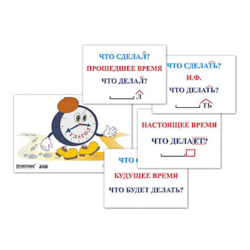 Автор: Ю.В. Кирилина Пособие предназначено для использования в качестве демонстрационного материала на уроках русского языка в начальной школе при изучении тем «Глагол», «Изменение глагола по временам». Комплектность: таблица – 1 шт., карточки – 4 шт., руководство по эксплуатации – 1 шт. Пособие состоит из полноцветной таблицы формата А3, ламинированной матовой пленкой, и 4 карточек формата А4. На таблице изображен глагол в виде путешествующего будильника. Карточки содержат информацию о временах глагола: названия времен (настоящее время, прошедшее время, будущее время, неопределенная форма глагола), вопросы и опорные схемы. Таблица и карточки снабжены магнитами, что позволяет легко крепить их на магнитной доске или экране для динамических пособий.
