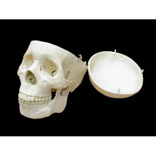 Пособие предназначено для использования в качестве демонстрационного материала. Модель высотой около 15 см, изготовлена из пластмассы. Модель является разборной, позволяет продемонстрировать расположение костей как снаружи черепа, так и внутри черепной коробки.