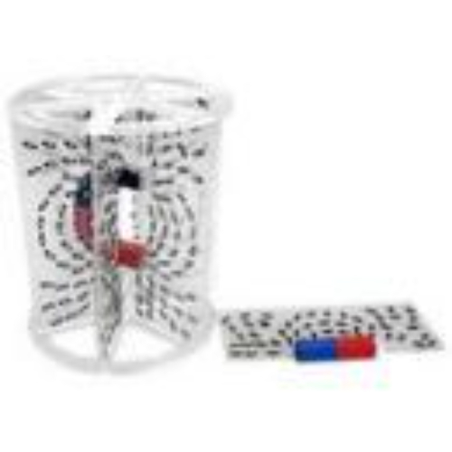 Модель предназначена для демонстрации распределения в пространстве линий магнитного поля. Габаритные размеры в упаковке (дл.*шир.*выс.), см: 20*19*26. Вес, кг, не более 1,1. Комплектность: каркас модели – 1 шт., сменная пластина – 1 шт., магнит полосовой – 1 шт., магнит U-образный – 1 шт., руководство по эксплуатации – 1 шт. Модель представляет собой дискретный цилиндр с шестью диаметрально и равномерно расположенными пластинами, одна из которых сменная. Модель выполнена из прозрачной пластмассы. На пластинах установлено множество легкоподвижных ферромагнитных стрелок. Одна из сменных пластин имеет дугообразный вырез для установки в модель U-образного магнита.