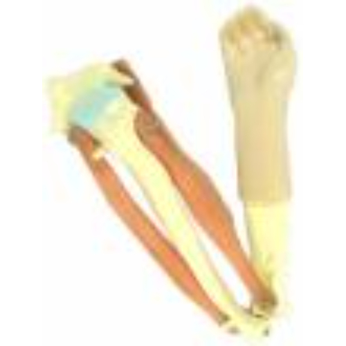 Пособие предназначено для использования в качестве демонстрационного материала. На модели изображены кости верхней конечности, мышцы сгибатели и разгибатели локтевого сустава. Длина модели около 50 см. Модель изготовлена из пластмассы, мышцы изготовлены из резины и крепятся к основе металлическими креплениями. На модели обозначены следующие детали строения локтевого сустава: кисть, локтевая кость, лучевая кость, мышца-сгибатель (двуглавая мышца плеча), мышца-разгибатель (трёхглавая мышца плеча).