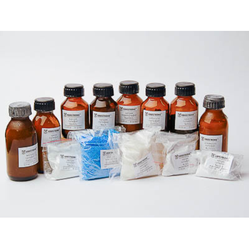 Состав набора (кг): Алюминия сульфат — 0,1. Аммония сульфат — 0,1. Железа (II) сульфат 7-в — 0,1. Калия сульфат — 0,05. Кобальта (II) сульфат — 0,05. Магния сульфат — 0,05. Меди (II) сульфат 5-в — 0,15. Натрия сульфат — 0,05. Натрия сульфид — 0,05. Натрия сульфит — 0,05. Натрия гидросульфат — 0,05. Никеля сульфат — 0,05. Цинка сульфат — 0,1. Железа (II) сульфид — 0,05. Меди (II) сульфат безводный — 0,1.